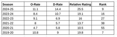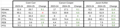 Additionally, the Spartan bigs, which may have become an offensive liability over the last few years, saw a nice increase in production this year.