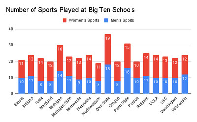 Michigan State competes in 23 sports (11 for men and 12 for women) while Ohio State leads the way by fielding an astounding 37 teams. After OSU, Penn State competes in 31 sports while Michigan sponsors 30. Northwestern has the fewest offerings at 19 while Maryland, Oregon, and Purdue compete in 20.