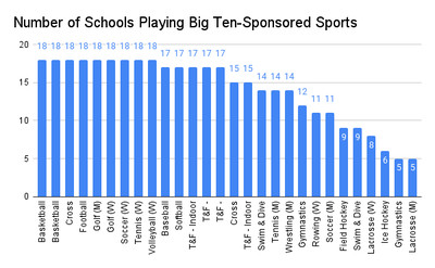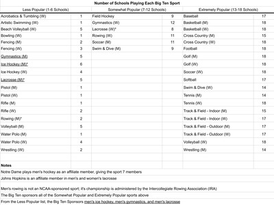 Not all of these sports, however, are sponsored by the Big Ten. This following chart shows all the sports that the conference does sanction and how many of the conference’s 18 teams compete in each one.