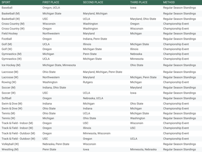Placement was determined by either regular season standings or a stand-alone conference championship event. If regular season standings were shown on the Big Ten’s website then those were used. If not, results from a conference championship event were used.
