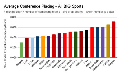 One last thing to look at from a competitive standpoint was how schools did across all sports. The following chart attempts to look at that by averaging a school’s placement position across all sports in which they compete. However, instead of just looking at average placement in the regular season standings or championship event, the number of teams a school had to compete against to earn their position was considered.