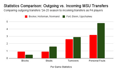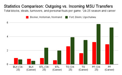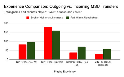 Combined, Booker, Holloman, and Normand have played in 179 games while Fort, Glenn, and Ugochukwu have seen action in 158. Last year, however, the new Spartans saw action in a combined 95 games compared to 83 for the players who transferred out.