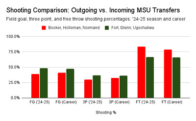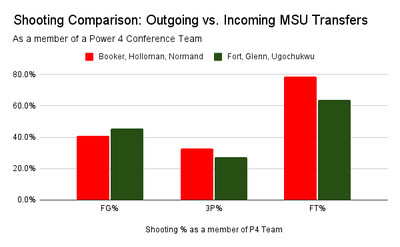Last season, and over the course of their careers, Fort, Glenn, and Ugochukwu have produced better shooting percentages than the players who transferred out, including at the three-point level. The free throw line, however, is another story. Normand never attempted a free throw in his time at MSU but Booker and Holloman hit from a much higher rate from the stripe than the incoming transfers.