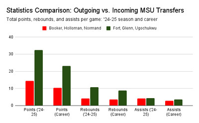 Additionally, Fort, Glenn, and Ugochukwu combined for 70 minutes per game last season which is more than the 38 minutes the departing players have left behind. Over their careers so far, the incoming Spartans have played a combined average of 58 minutes per game compared to 31 for Booker, Holloman, and Normand.