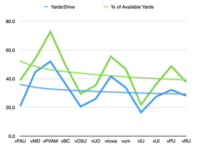 Yards per Drive and Percentage of Yards Gained both trended downward in lock step throughout the season. However, those trend lines don’t reflect the inconsistency of the game performances the way those camel humps do. Hit close to 50% efficiency and we’re winning the games. Unfortunately, the season trended towards 40% (and generously so, as I used the logarithmic fit for the aesthetics, instead of the polynomial – even though the latter is better for such fluctuations). The other part of that is, getting close to 50% of the yards, mixed with Jonathan Kim, means we’d often be walking away with at least three. If we can get that starting field position closer to 70 than 80, that kick becomes a lot cleaner.