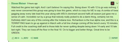 Speaking of not being surprised, that is how you all should have felt watching MSU come back against Iowa on Thursday night. For getting this right, I am even going to give out a “Reader Of The Week” award to Steven Weiner: