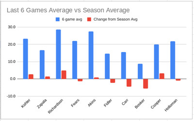 Even with that lower output, and unsurprisingly since he’s now a starter, Richardson has seen the biggest increase in minutes since the lineup change. In the last six games, Jase is playing nearly five minutes per game more than his season average.