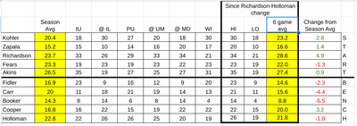 After Jase, Jaxon Kohler’s minutes have gone up nearly three per game and this is probably influenced by 30-minute outings against Illinois and Wisconsin. Jeremy Fears’ minutes have gone down by a bit (1.3 per game) but generally, other than Richardson, the starters are playing about the same amount since Richardson began starting.