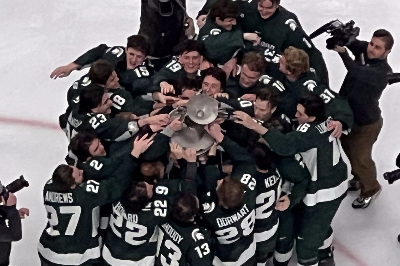 Period three is where the wheels of sportsmanship started to fall off and the utter disdain of certain colors took over. Larson got an early goal at 1:15 when the puck went off his skate from a Dorwart shot and into the net. MSU was then up 4-1 and it was already clear their conditioning was playing a factor. They were out skating, hustling to beat icing calls, playing with longer sticks and keeping the weasels gasping for air. You knew it was going to start getting ugly when, I believe it was Stramel, was knocked down in front of Korpi and his skate caught the goaltenders arm and Korpi clearly thought it was intentional and shoved a fist into his back. This started a small skirmish in which Felicio was given a roughing penalty. At 7:49, Shoudy connected with a nice slap shot and put MSU up 5-1. At about the 14 minute mark is when all the extra curricular activities started to take place. Howard was face masked and bleeding in from of the weasel bench when Shoudy and the Spartans came over to defend the nation’s top goal scorer. I am not going to spend a lot of time commenting on the fact that MSU had too many penalties because as a hockey fan, and hater of everything the color of corn, I was enjoying the fight back and aggression. A lot of MSU’s penalties were really for some sloppy stick play as hooking was happening a lot. I also loved that Nightingale challenged the call and returned the favor to Naurato and won the challenge to give Hage the major. With the Spartans on the 5-3 advantage, Howard got his revenge with his 22 goal of the season. MSU skated of to the 6-1 victory and trophy presentation.
