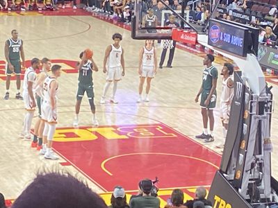 My biggest takeaway from this game was the Spartan fans, including Magic Johnson, showing up. They were noticeable outside the arena before the game and certainly inside during the game, where it appeared to be at least 50% Green and White faithful, if not more. There was a loud “Go Green, Go White!” as the Spartans came out for the second warm up period as the arena was filling up. No response from the USC faithful resulted in the USC DJ turning up the music to drown it out. I’m not sure if having a DJ at a basketball game is a thing now but it does seem quite appropriate for LA.