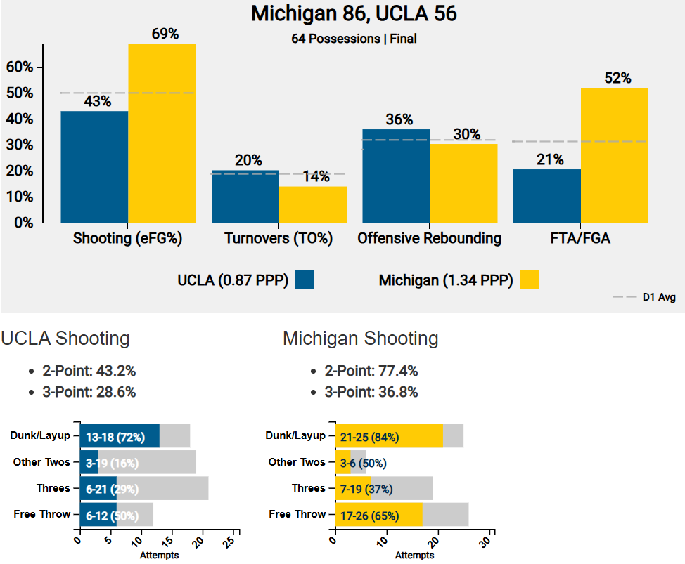UCLA was able to keep the game within reach for a decent while — and had a promising run to head into halftime down just two. But failing to ever actually overtake the lead at any point and falling behind big early in the second half, the Bruins were never really in a position to upset Michigan. Against a middle-of-the-pack Big Ten opponent, the Wolverines controlled as expected.