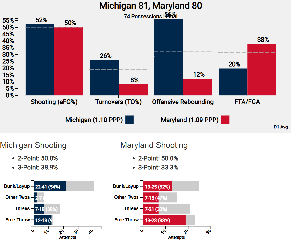 Michigan and Maryland exchanged heavyweight blows in a wild and topsy-turvy affair. It wasn’t a perfect night for either team, but there were perfect stretches for both. Big runs were the name of the game. The Wolverines went on an 18-0 run that spanned halftime, but the Terps responded with two killshots in the second half.