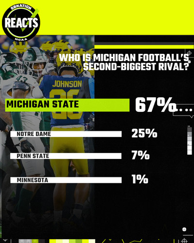 67% of voters believe the Michigan State Spartans are Michigan’s second-biggest rival while 25% believe it’s the Notre Dame Fighting Irish . Penn State received 7% of the vote and Minnesota just 1%.