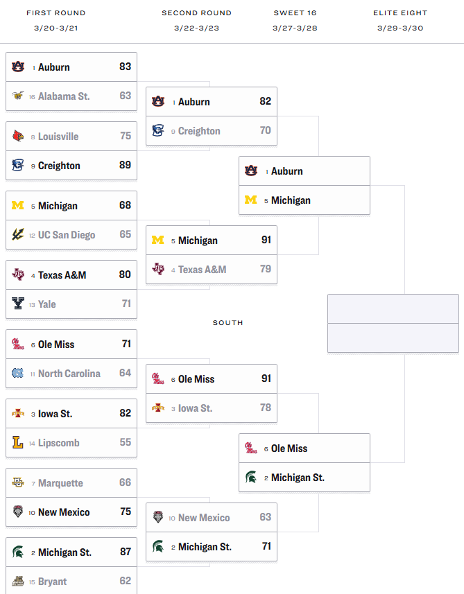 South Region games are played on Friday and Sunday in Atlanta. The winner of Michigan-Auburn will face the winner of No. 2 Michigan State and No. 6 Ole Miss in the Elite Eight.
