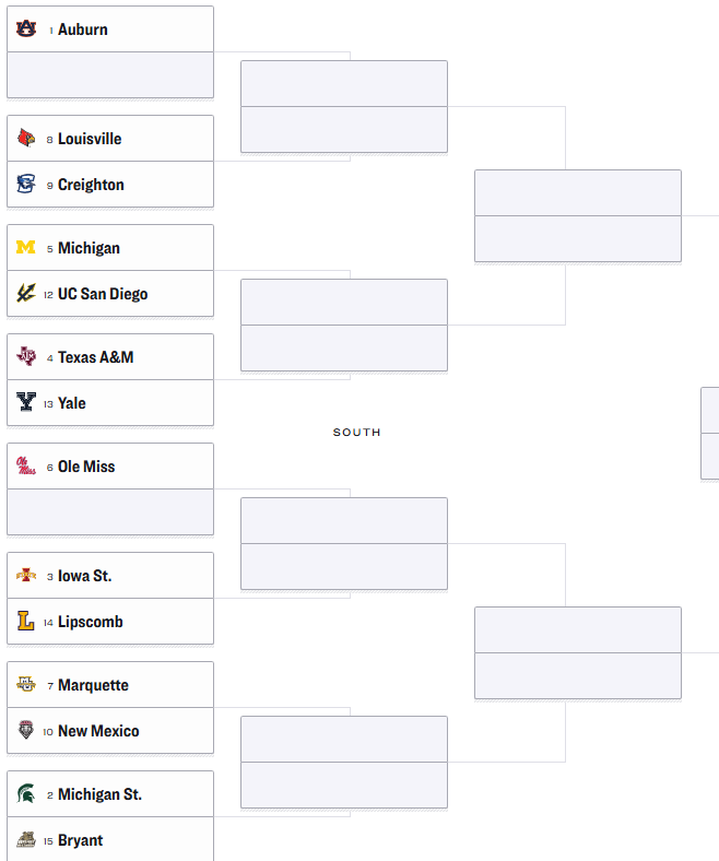 No. 1 Auburn, No. 2 Michigan State, No. 3 Iowa State are the top-seeded teams in the South.