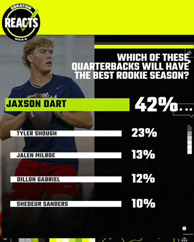 In our national SB Nation Reacts survey we asked which quarterback will have the best rookie season. New York Giants QB Jaxson Dart received 42% of the vote, however, he’ll have to leapfrog Russell Wilson and Jameis Winston on the depth chart.