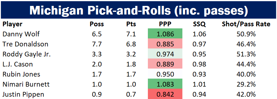 Wolf isn’t just a skilled big in Michigan’s system – he’s the primary playmaker. He leads the team in points created from ball screens, with his usage increasing from 4.5 ball screen plays per game in non-conference play to 8.1 in league action. For a 7-footer to grade in the 90th percentile as a pick-and-roll creator, per Synergy, is virtually unprecedented.