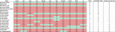 The Lions’ offensive roster bubble saw its biggest changes on the offensive line. After a fantastic showing as the team’s starting right guard, Kayode Awosika is now a unanimous “IN.” Conversely, that has plummeted Netane Muti—the other veteran guard who is arguably fighting Awosika for a roster spot—to zero votes. Muti was actually solid in the game, too, but he was clearly overshadowed by Awosika.