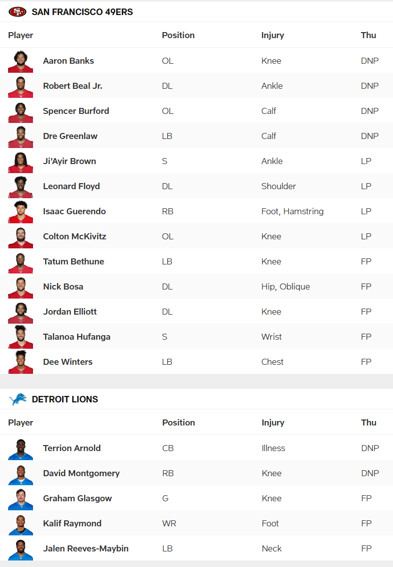 The only team more injury-ridden than the Lions this year might be the San Francisco 49ers, who were the NFC-favorites prior to the start of the season. A brutal run of injuries has led them to a 6-9 record: