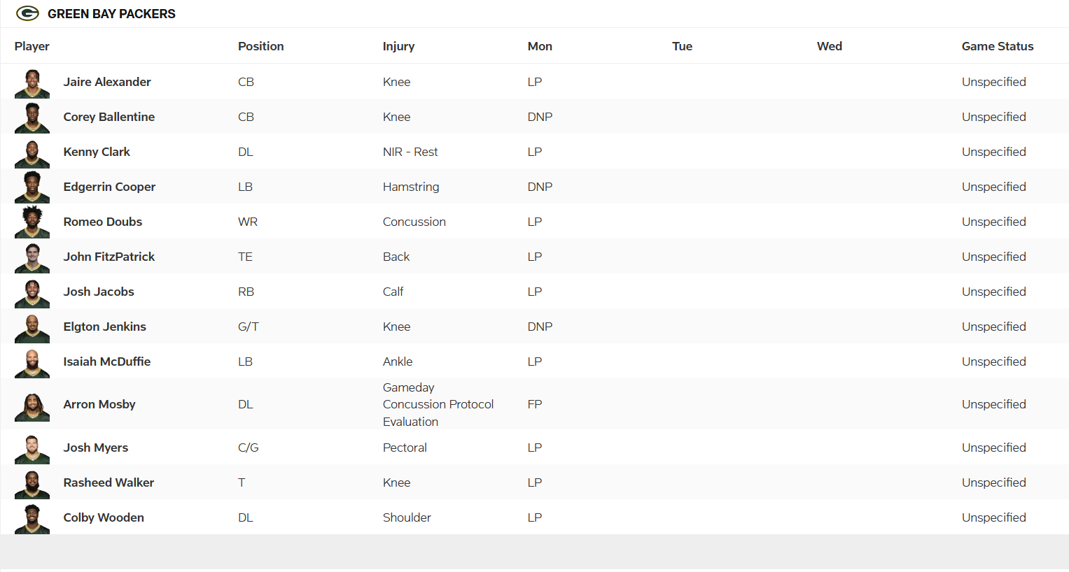Doubs missed last game with a concussion. It looks like he’s progressing well through the protocol and will play. He has been productive with 34 catches for 483 yards this year which is second on the team behind Jayden Reed.
