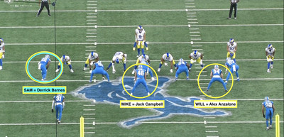 There is a third, hybrid linebacker role called the SAM (Derrick Barnes), but it does not operate like a traditional SAM in a 4-3 scheme. In Detroit, the SAM is deployed outside the tackle box, typically on the line of scrimmage. SAM responsibilities include rushing the passer, overloading the box in certain running situations, and dropping into coverage.