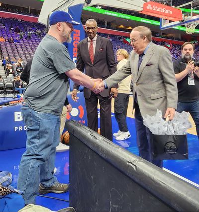 As warmups wrapped up, two Detroit sports icons, impeccably dressed as always, walked up to meet Merwinly and his family. George Blaha and Greg Kelser are class acts, and the main thing I felt from their presence is that they shared the same passion for connection to the community that we did as friends and diehard Pistons fans. Despite a tight pre-game production schedule, they spent time with Merwinly and his family, offering words of encouragement and support in the exact same way that DBB has offered so many of us over the years. The Pistons capped this moment off by sending Merwinly a signed picture of George, Greg, and Merwinly’s family courtside.
