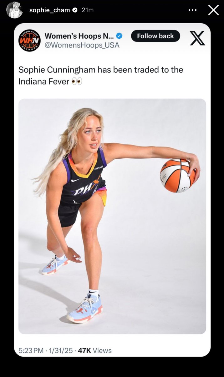 NEW: On the Fever’s active day, bringing back Natasha Howard and then becoming the third team in a deal — acquiring Sophie Cunningham and sending NaLyssa Smith to Dallas.