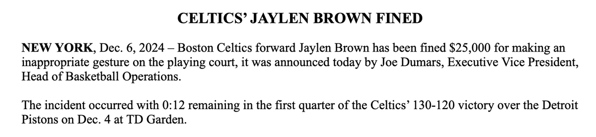 #Celtics forward Jaylen Brown gets 25K fine by #NBA for his throat slash gesture after dunk on Isaiah Stewart in win over #Pistons . – 1:10 PM