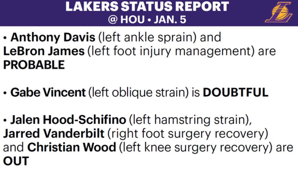 Lakers injury report for tomorrow at Houston: Anthony Davis (left ankle sprain) and LeBron James (left foot injury management) are listed as probable.