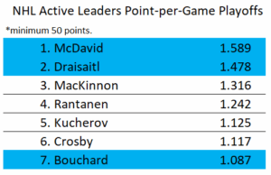 It’s somewhat hard to believe it took us so long to mention McDavid’s partner-in-crime, Dr. Drai. Studying the current best in terms of active players in points-per-game in the playoffs , the list is quite impressive for the Oilers.