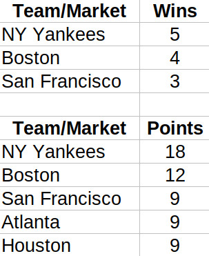 Here’s the leaderboard for each league’s championship winners and fan-points since 1995. First, MLB: