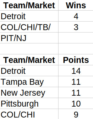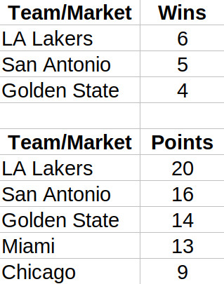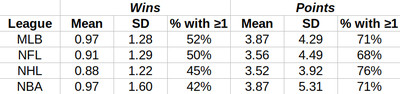 The numbers that jump out at me here are the standard deviations in the Points column. For the NHL, there’s a lot more parity in terms of teams getting to the Stanley Cup Finals than for other sports’ championship finals. The NBA has the largest SD, with NBA Finals appearances dominated by a few heavy hitters such as the Lakers , Spurs, Warriors and Heat.