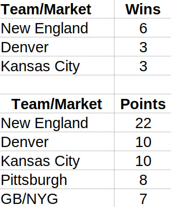 If we expand this out to include teams that have made it into the finals, over three-quarters of NHL markets have had their team in the Stanley Cup finals (heh, Leafs) but only a bit more than two-thirds of NFL teams have seen a Super Bowl.